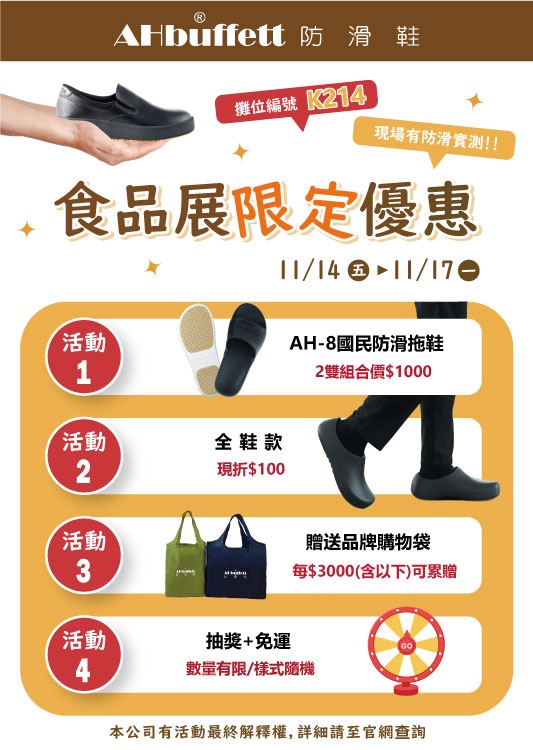 - 展場期間購買任一雙鞋款現折$100,防滑拖鞋2雙$1000。