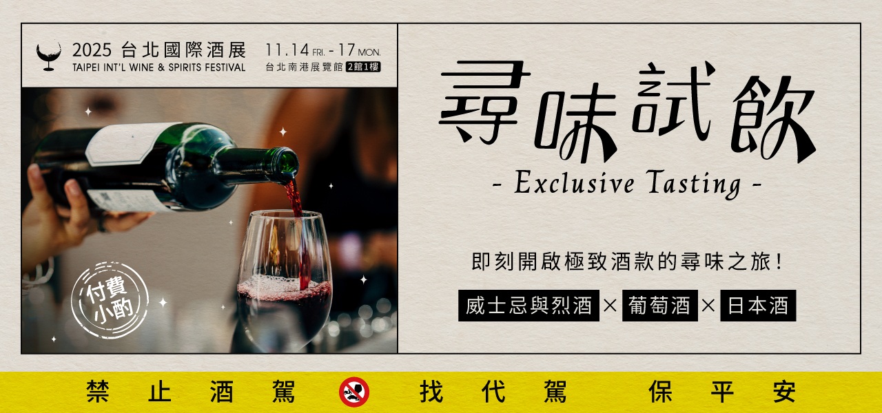 台北國際酒展特別規劃 「尋味試飲」 活動,蒐集各參展廠商於展場提供的 付費試飲酒款。酒友們能更輕鬆找到心儀的酒款,親自品嚐不同產區、不同風格的精采風味,開啟專屬於你的探索之旅。