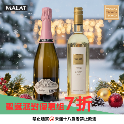 聖誕節限定組合,以 MALAT 2019 Sekt Brut Rosé 氣泡酒搭配 TSCHIDA 2024 Auslese 貴腐甜白酒,結合節慶氣氛與奧地利風味。細緻氣泡與蜜香甜韻交織,象徵派對與祝福的完美搭配。展場購買組合享 7 折優惠。