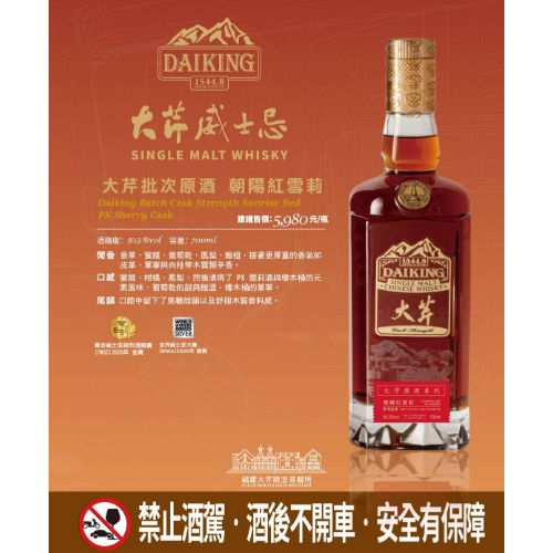 在西班牙 PX 雪莉桶,經長時間的熟成,而有著閩南大芹山風土的韻味。這是一支純正典型的雪莉桶威士忌,熱情而奔放,朝氣而有活力,如朝霞自地平線開始渲染,直至日出的那一剎那,熱情溫暖的赤紅朝陽照耀整個大地,迎來美好的一日。
