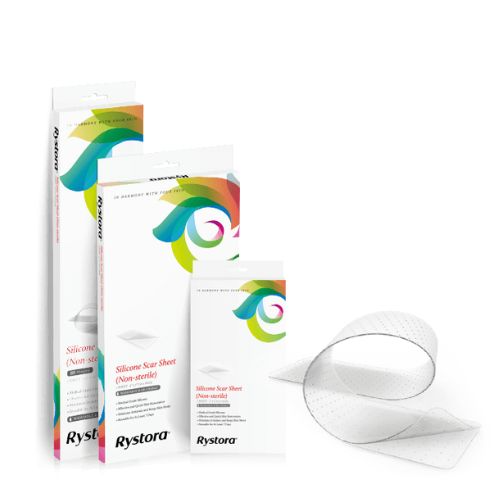 Rystora®Silicone Scar Sheet made of medical grade silicone, with patented micro-pore structure that balances the moisture content of the tissue. Locking in moisture where needed and eliminating excess moisture, resulting in softer tissue and quicker rejuvenation. For keloidal scars, surgical scars , burned scars, new or old operation scars.
