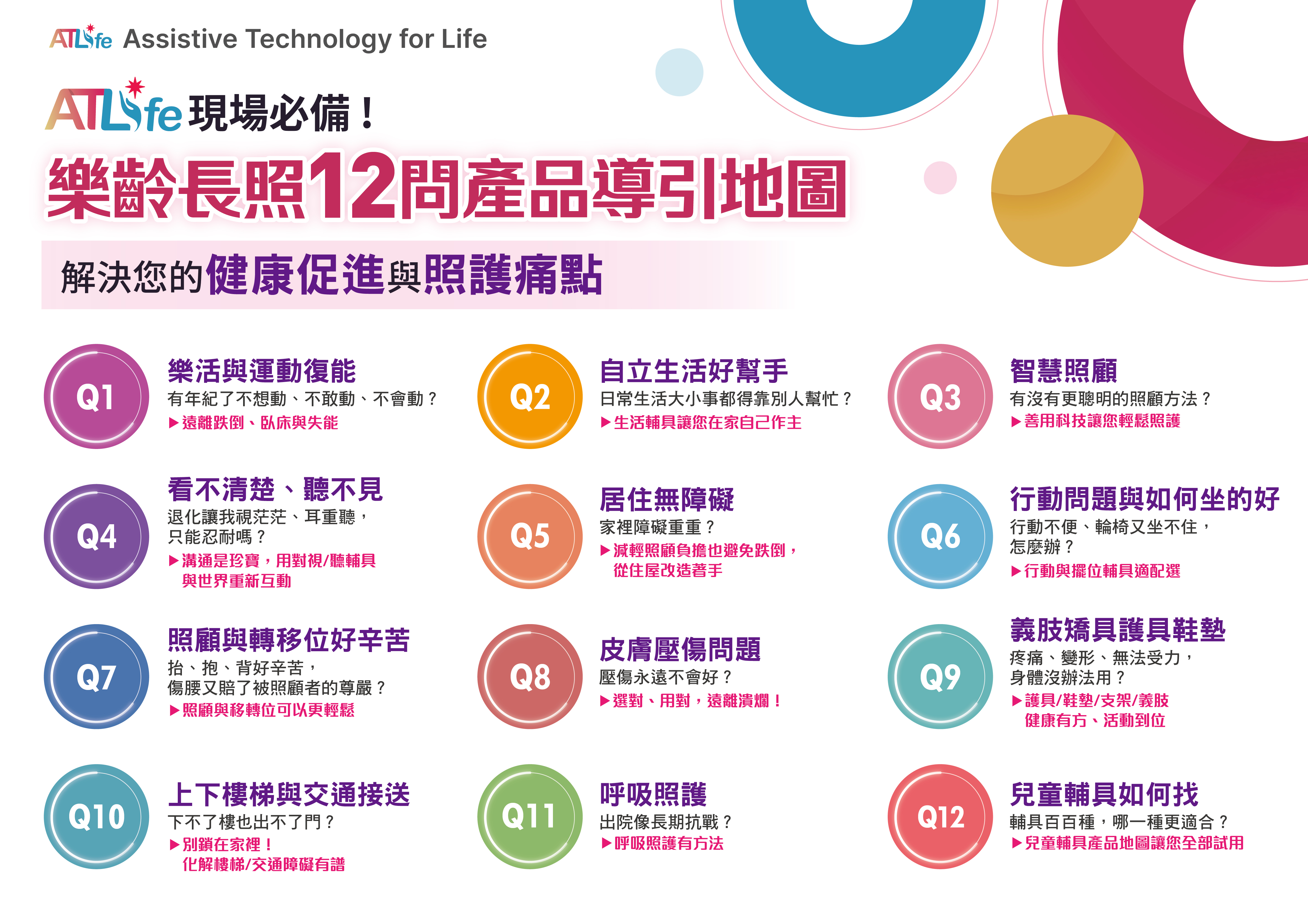 由策展人國立陽明交通大學ICF暨輔助科技研究中心李淑貞主任發想之「樂齡長照12大哉問」為依據,統整出在長照路上最常遇到的12大項問題,給予最精準的問題解方,讓所有人都能夠事先為自己與家人的第三人生做好準備: