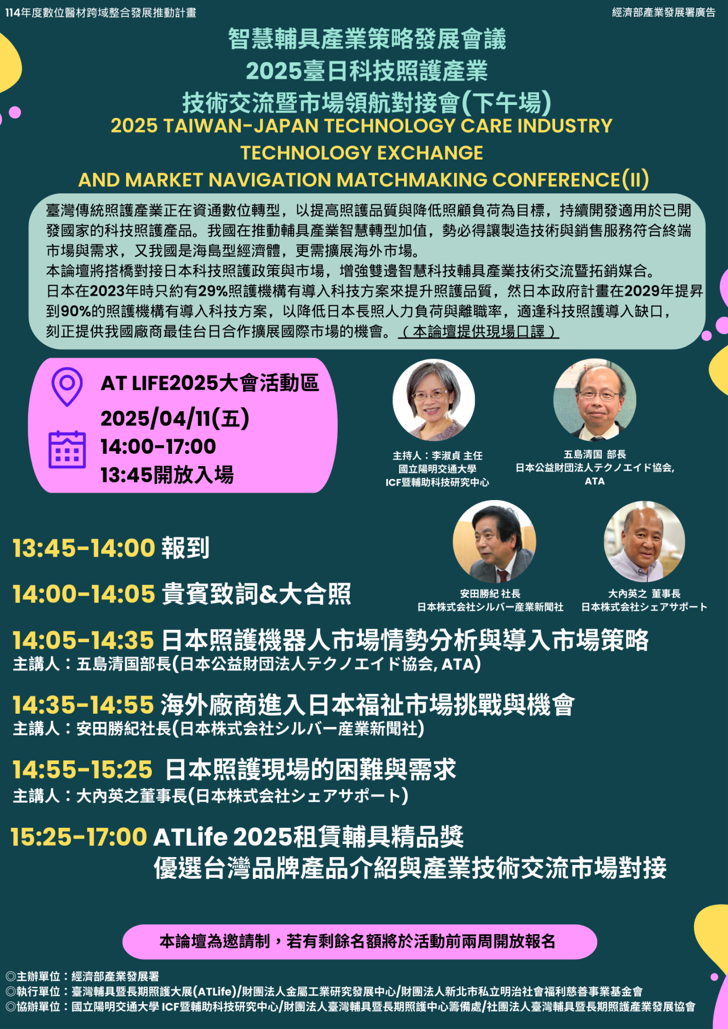 臺灣傳統照護產業正在資通數位轉型浪潮上,以健康促進及提升照護品質與降低照顧負荷為目標,陸續開發即便是已開發國家的健康照護成熟市場,仍具市場潛力的科技照護好產品。我國在推動輔具產業智慧轉型加值,勢必得讓製造技術與銷售服務更貼合到終端市場及使用需求,尤其我國是海島型經濟體,更需擴展海外市場。本論壇將搭橋對接日本科技照護政策與市場,增強雙邊智慧科技輔具產業技術交流暨拓銷媒合。尤其,日本在2023年時只約有29%照護機構有導入科技方案來提升照護品質,然日本政府計畫在2029年能提昇到90%的照護機構有導入科技方案,期能降低日本長照的人力照顧負荷與離職率,而日本這廣大科技照護導入缺口,刻正提供我國廠商最佳台日合作擴展國際市場的機會。(※本論壇提供現場口譯)