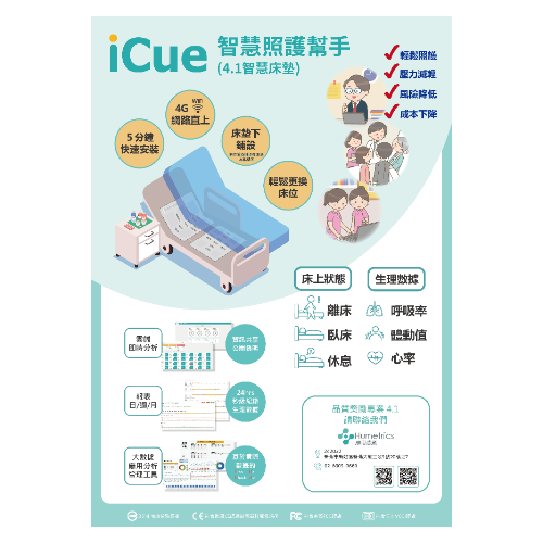 iCue 智慧感測墊,放置於一般睡眠床墊下,可偵測用戶在床上的即時行為狀態,如在離床通報、久臥通報等,同時提供長期連續性且非接觸式的生理狀態監測,包括呼吸率、呼吸波形及心率等,藉由 AI 數據分析及真人客服團隊,提供全方位的用戶專屬健康照護服務。