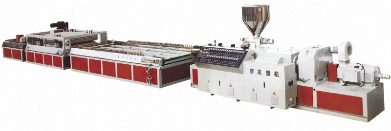 YF series PVC furniture board production line is commonly used for indoor decorational board making, including ceilings, wall panel, door plate, etc. Available production range is from 400mm to 1000mm (board width). A complete production line consists of conical twin screw extruder, extrusion mould, vacuum calibration table, haul-off unit, cutter and automatic stacker.