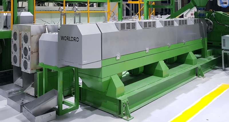 THE RAW MATERIAL IS SPUN THROUGH THE NARROW SPINNERETS OF THE EXTRUDER.