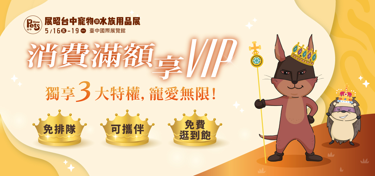 大會推出最尊榮、最霸氣的「VIP特權」回饋給最支持展昭寵物展的朋友,凡當日於展場消費滿2萬元者,即可成為展昭寵物VIP!擁有VIP特權的朋友可在展昭寵物系列展暢行無阻,享受展昭寵物展獨家VIP禮遇!