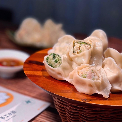 (2) 麻辣貢菜水餃 – 以麻辣鍋為發想,加入大陸麻辣鍋常見的食材-貢菜,吃起來嘎嘣脆,所以又名饗菜,為使用麻辣乾碟粉調味的豬肉餡增添了脆口的口感。又麻又香的內餡、辣中帶脆的口感,彷彿有種正在吃麻辣鍋的錯覺呢