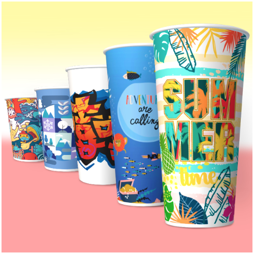 Hot and cold paper cups available in 8, 12, 16, 20, and 22oz sizes. Made with food-grade materials and PE coating for water and oil resistance. Supports full-color digital printing and custom branding