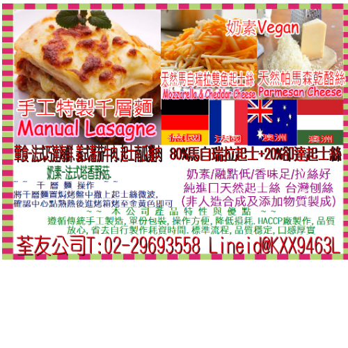 手工千層麵 為專業Haccp Iso認證工廠生產 為知名飯店 義式料理所使用之商品 只要微波加熱 灑上起士絲進烤箱烤至金黃色 即是飯店主廚的手工料理 方便操作 穩定的品質 深受好評 是出餐用的好夥伴