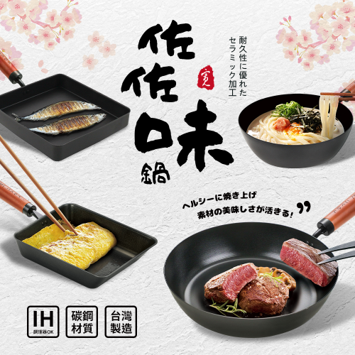 ●本體是碳鋼材質,採用日本三層陶瓷不沾,鍋底非直角可以輕鬆翻面且不易沾黏。