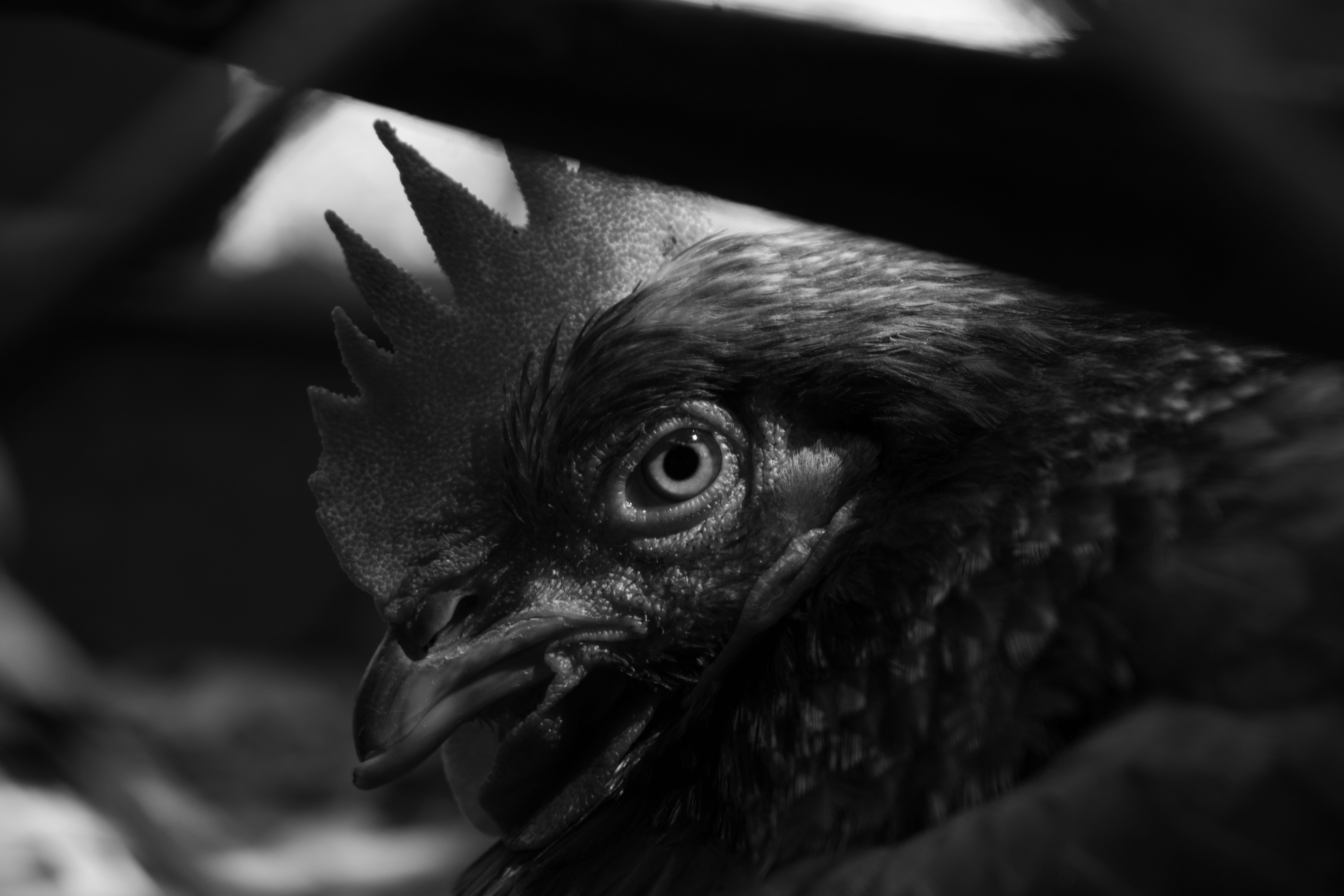 這張黑白照片捕捉了雞的凝視,展現出一種意外的張力與情感。凝視是動物之間建立關聯的重要方式,透過鏡頭,我們能感受到雞眼中的靜默與專注,彷彿在思索著某種深層的存在意義。黑白攝影剝除了色彩的干擾,將視覺的焦點集中在光影與形態之間的微妙對比,強調出這一刻的純粹與永恆。凝視與黑白的結合,使得這張照片不僅是視覺