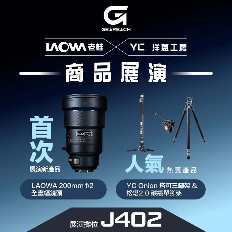 Geareach將展示 Laowa老蛙最新款鏡頭,首次在展會展覽,並現場提供即場試拍,讓您親身感受其超凡表現。此外,YC Onion洋蔥工房的熱賣單腳架與三腳架亦提供展演,結合穩定性與便攜性,滿足各種拍攝需求。無論您是專業攝影師或業餘愛好者,Geareach 攤位將為您開啟全新視野,探索尖端攝影科技與創意可能。蒞臨攤位,體驗攝影的無限魅力!