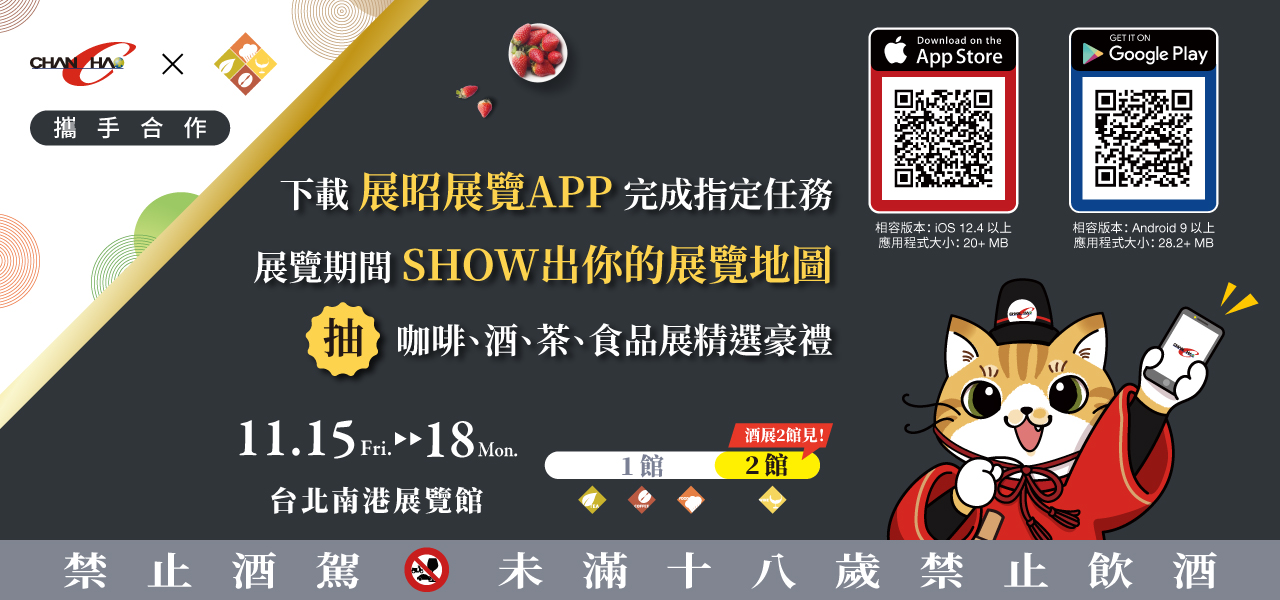 「展昭展覽APP」攜手「台灣國際咖啡展」、「台北國際酒展」、「台灣國際茶業博覽會」、「台灣國際食品暨設備展飲食系列展」四大展會,只要下載APP並收藏參展廠商,於展覽期間(11/15-18)至指定櫃台SHOW出你的數位展覽平面圖,審核通過後即可參加飲食系列展豪禮抽獎!