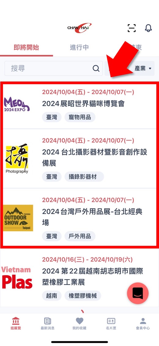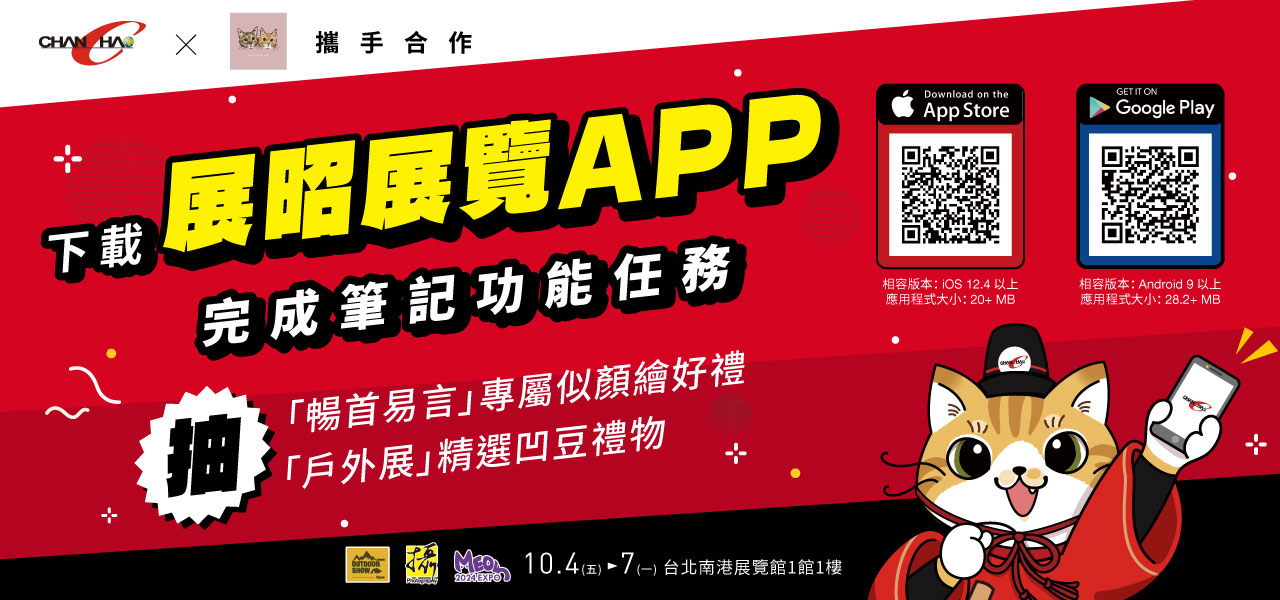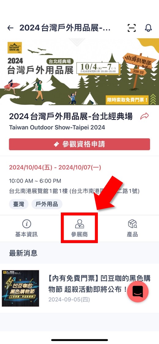 - 進入【展昭展覽APP】>點擊【2024台灣戶外用品展-台北經典場】或【2024 台北攝影器材暨影音創作設備展】或【2024展昭世界貓咪博覽會】任一展覽