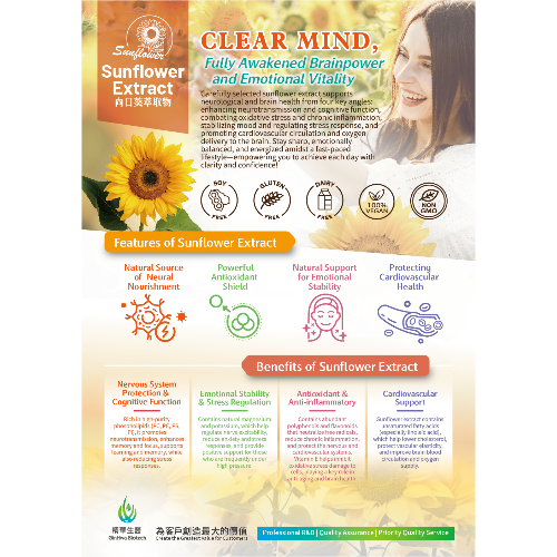 Carefully selected sunflower extract supports neurological and brain health from four key angles: enhancing neurotransmission and cognitive function, combating oxidative stress and chronic inflammation, stabilizing mood and regulating stress response, and promoting cardiovascular circulation and oxygen delivery to the brain. Stay sharp, emotionally balanced, and energized amidst a fast-paced lifestyle—empowering you to achieve each day with clarity and confidence!