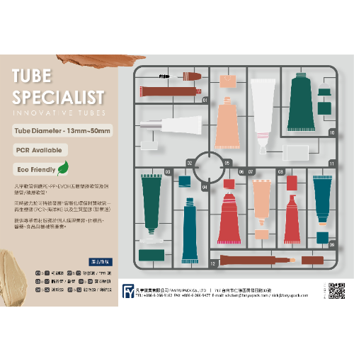 FAN YU PACK innovative tube specialize in all series of plastic tube production. Including: Cosmetics, colored cosmetics and personal products.Suitable for all types of liquid packaging, ranging from cosmetics, medicine, food, oil, chemical, detergent...