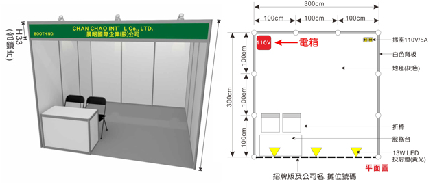 - 基本隔間攤位:包括三面隔板、三盞投射燈、地毯、公司全銜招牌一組、接待桌一張、折椅二張、5A獨立電箱及110V插座一個,每一攤位NT$ 61,425元(含稅)。【勾選含基裝確認繳費後,將不得再辦理基裝退費。】