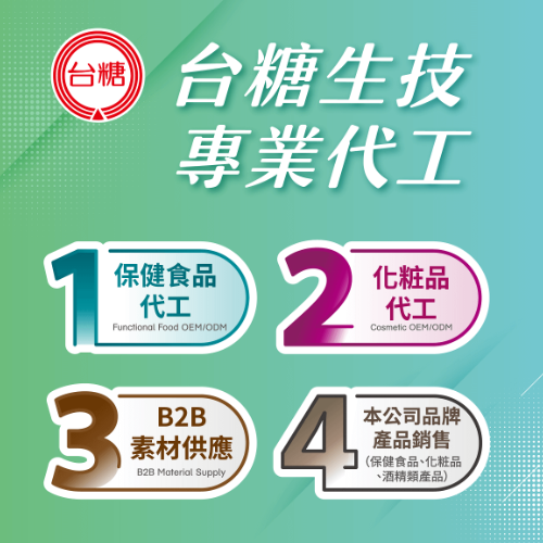 化妝品:台糖生技工廠取得化妝品GMP認證,符合ISO22716化妝品品質安全承諾,自產動植物性的原料,以確保本土化素材與創新技術。