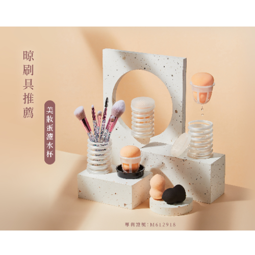 【濾水杯】:符合美妝蛋大小,專利六條凹槽設計,穩固支撐並給予空間透氣,特選AS材質不會生鏽,不會影響美妝蛋品質