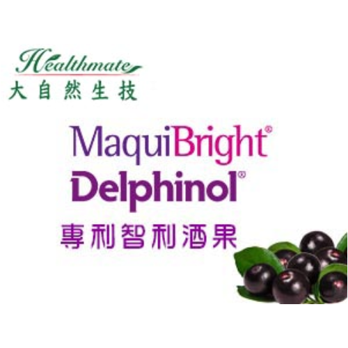 來自智利天然野生的智利酒果,經德國PIC/S GMP專業生產,擁有Kosher、Halal認證,高濃度萃取約30kg新鮮果實僅能萃取出1kg的智利酒果萃取粉且原料水溶性佳、適合各種劑型,標準化定量成份飛燕草素(Delphinidins)高達25%,於2018取得日本功效專利,並有多篇國際文獻發表。專利智利酒果(MaquiBright®/Delphinol&®)每日使用劑量低,有助於調節生理機能、健康維持、養顏美容等。