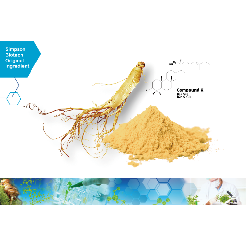 全世界學者一致認定,Compound K (CK) 就是人參皂苷最重要的功效成份之一 人參是廣為人知的中草藥,具有增強體力及消除疲勞等效用。然其成份複雜,有人參皂苷、人參多醣、蛋白質、芳香烴、脂肪酸、維生素、礦物質等成份。根據世界各國學者研究結果顯示,人參的成份中最具效果的即為人參皂苷 (Ginseng Saponin或Ginsenoside),可粗分為二醇 (占多數) 或三醇型人參皂苷。人參皂苷CK為二醇型皂苷於人體腸道內的主要降解產物,也是人參皂苷在人體主要的最終吸收形式,可說是人參皂苷最重要的功效成份之一,因此已成為人參皂苷研究的新焦點。