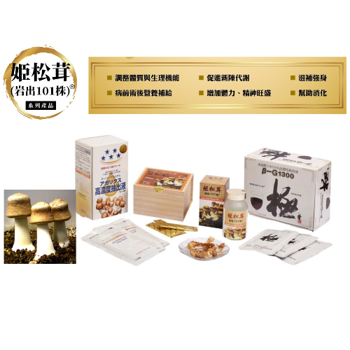 一枝獨秀的營養補給品──姬松茸(岩出101株)®多醣體含量豐富,是優質的β(1-3)、(1-6)-D葡聚醣蛋白多醣體,同時也含有核酸、不飽和脂肪酸、各種維它命、礦物質等多種營養素。絕不同一般之姬松茸(巴西蘑菇),健康能量有口皆碑。