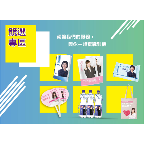 我們還提供各式競選產品之印刷及代工,就讓我們的專業服務和您一起奮戰到底吧!