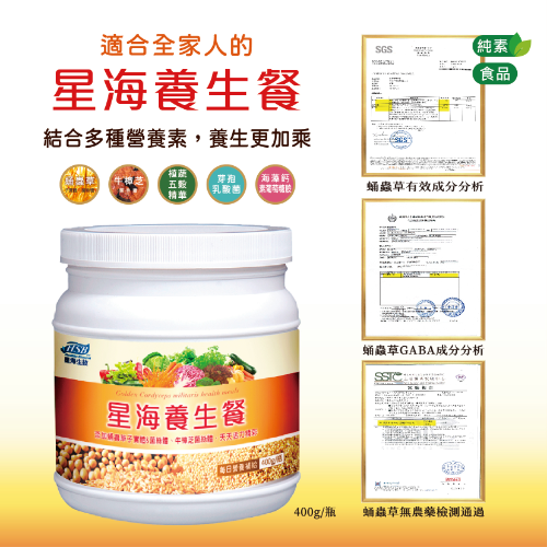 結合六大營養配方,蛹蟲草、牛樟芝、植蔬五穀精華、芽孢酸菌、海藻鈣素葡萄糖胺等食材,以食療觀念的均衡養生之道,精心調配出含膳食纖維的營養活力餐,是養身的營養補充飲品。更是適合全家人的養生餐。
