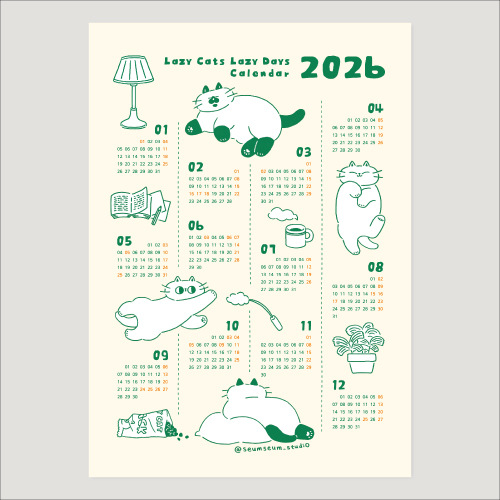 We imagined and designed a peaceful daily life with lazy, relaxed cats. We hope this calendar helps your 2026 be a year of ease and tranquility.