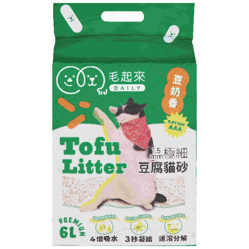 毛起來1.5mm極細豆腐貓砂成團快速清潔容易,超強4倍吸水力能瞬間吸收大量水流,3秒迅速成團挖起不崩散,能緊密包覆並吸附臭味,可沖馬桶不堵塞。