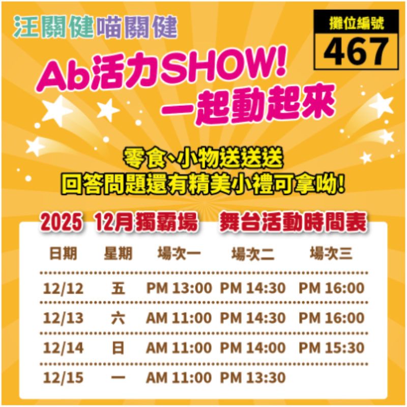 所有展覽攤位活動皆由參展廠商自行規劃與舉辦。活動內容應遵守中華民國相關法令,並不得有違反善良風俗、色情、暴力、賭博、侵權或涉及任何不法行為。主辦單位僅提供平台,不對各攤位活動的內容、品質或合法性負任何擔保責任。 參與者應自行評估並承擔風險。若發現任何不當行為,主辦單位將保留中止該活動或取消參展資格的權利。