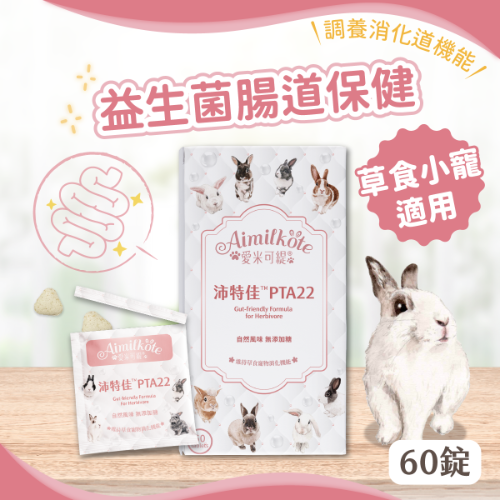 愛米可緹獨家專利研發,耗時四年,專為草食寵物設計的益生菌。無添加糖,自然風味,益生只為你❤️「這不是一款香甜好吃的益生菌,卻能夠幫助草食寵物維持良好的消化機能!」從兔兔盲腸便篩選出來,才是最適合兔兔的益生菌!市面上的益生菌種類繁多,選用的原料大多適用於人或其他動物,一般具有消化酵素作用的益生菌通常只針對蛋白質、脂肪與澱粉的消化,對於分解纖維與果膠(水溶性纖維)的作用極小,然而兔兔是全素食小動物,牠們每天所吃的食物中含有大量的纖維及果膠,體內的蛋白質及澱粉其實都很微量 ,因此牠們所需要的益生菌,必需是能夠分解纖維與果膠的,只有選擇最適合兔兔的益生菌,才能幫助製造營養豐富的盲腸便,讓腸道更健康!
