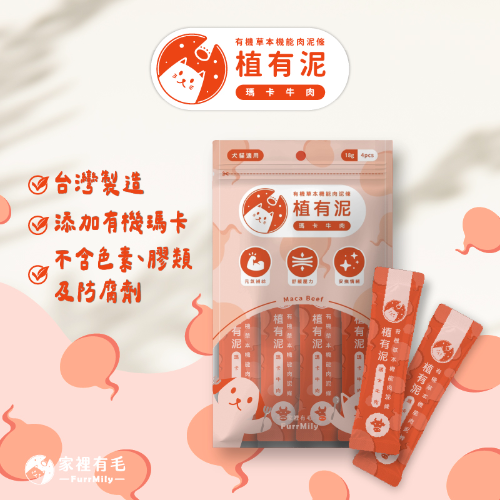 首頁 / 參觀資訊 / 參展商產品 / 植有泥|有機草本機能肉泥條-瑪卡牛肉