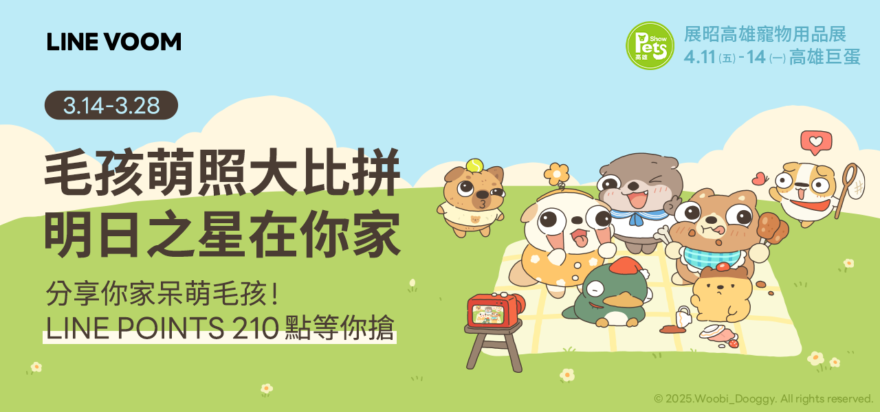 - 毛孩萌照大比拼活動由LINE VOOM主辦,詳細的活動資訊、獎勵備註以及活動注意事項,請詳閱LINE VOOM活動頁之活動辦法。
