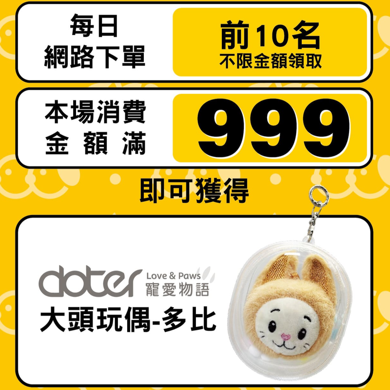 活動期間,每日於網路商店完成下單之前10名訂單,可不限金額獲得 Doter多比玩偶乙隻。 凡單筆訂單消費滿 NT$999,亦可獲得 Doter多比玩偶乙隻。 符合任一贈送門檻,即享贈禮資格。