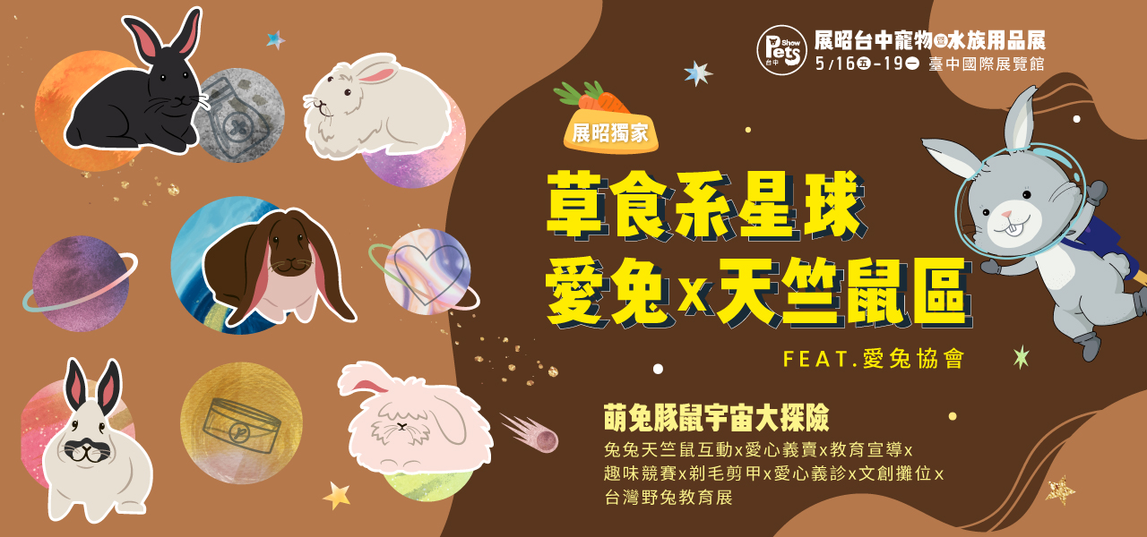 中台灣的兔友們!本屆寵物展愛兔區由台灣愛兔協會規劃。專區內設有兔兔友善運動場、兔兔及天竺鼠認養、醫療義診、靜態教育等主題區塊,並透過兔奴聚會、趣味競賽等方式,讓民眾可以在最短的時間內認識兔兔、天竺鼠等小動物,革除過去舊的錯誤飼養觀念,讓社會大眾對兔兔和天竺鼠有更深入的瞭解喔!
