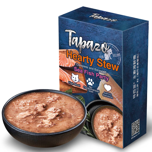 Tapazo特百滋貓咪主食餐包-主廚海鮮燉,嚴選高品質肉品製成,匠心慢熬煮出濃郁鮮湯,不含穀類、爭議膠類、澱粉,符合AAFCO與NRC貓主食營養規範,並添加多元維生素、礦物質,天天吃安心又健康!