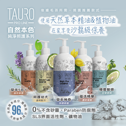 🔸純淨照護系列:透過毛孩養護3步驟:1️⃣深層清潔2️⃣專業功能洗3️⃣;專業功能或造型修護。依據毛孩毛髮需求,依據毛孩所需挑選推薦款式使用,呈現出持久亮麗光澤毛髮或自然蓬鬆感。🔸極致照護系列:🔹淚痕潔毛膏🔹精油(禿毛症、皮膚敏感搔癢等皮膚問題適用)在洗澡時,搭配離子水和火山粉厚膚用最讚🔹免沖洗噴霧(抗糾結、空氣感、濃密噴霧)。更多資訊請至:https://www.naturesprotection.com.tw/pages/tauro-pro-line-home