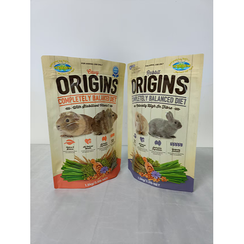 K-shaped self-standing easy-tear zipper bag with a bottom, three-layer material composite enhances the bag's strength, has good preservation, moisture-proof and oxygen-proof performance, bright printing colors, high color reproduction, wide and three-dimensional bag shape, convenient for shelf display and storage, supports gravure and digital printing, suitable for packaging various pet foods such as main food, freeze-dried, wet food and snacks.