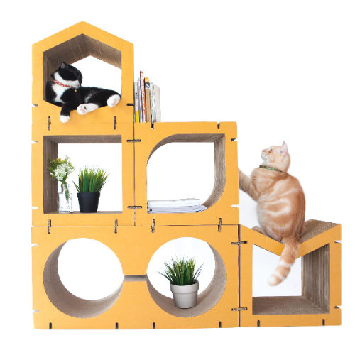 HOME is a modular cat scratcher series designed for both cats and their owners. Each piece can be connected to create a custom cat home, featuring a central gap for play and rest. Securely locked with cardboard connectors, HOME is made from high-quality, eco-friendly cardboard by KAFBO.