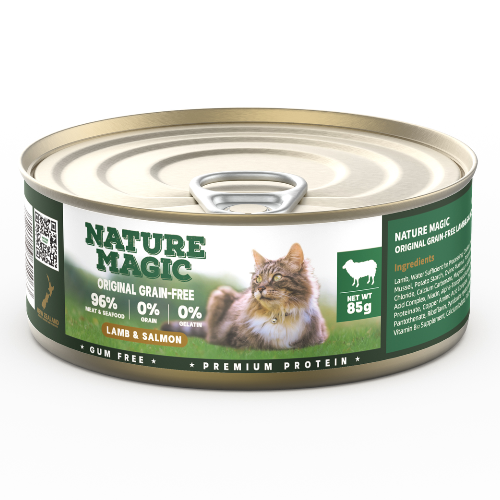嚴選放牧羊肉與深海鮭魚,打造高蛋白、富含 Omega-3 的無穀主食罐。羊肉富含鐵質與維生素B群,有助於增強免疫力;鮭魚則提升適口性,讓貓咪愛吃又健康。96%高含肉量、無膠無誘食劑,是成貓日常餵食的安心首選。
