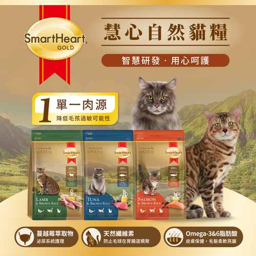採用鮭魚、鮪魚或羊肉為第一主成分,提供完整優質蛋白,支持肌肉發展與貓咪活動力
