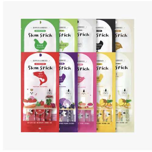 5km Stick系列中的肉泥中原封不動的保留著自然的顏色。使用代表個顏色食品的健康食材料製作而成。具有豐富營養以及嗜口性高的產品。以優質蛋白作為主要原料,用多種顏色的新鮮材料為主調增添營養性。