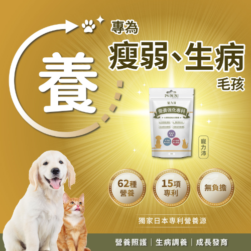 PS BUBU 寵力沛是革命性的毛孩健康維持全效營養,含62種天然成分的頂級活性配方,24項多國專利認證,添加日本專利新型態營養源-裸藻及富含BCAA的日本雪印專利乳清胜肽,研究顯示專利天然營養對肝腎的負擔小、吸收利用率高,能有效幫助毛孩成長發育、維持健康、均衡營養、生病調養、增進活力,不僅適合所有毛孩,對於腎病及腫瘤毛孩的營養照護更能有絕佳的幫助!