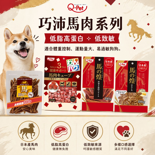 最新上市! 使用日本產馬肉製作,低脂高蛋白肉源,適合減重、運動量大、注重體態狗狗。單一蛋白質肉源不易過敏,尋找低敏零食毛孩的最佳選擇!