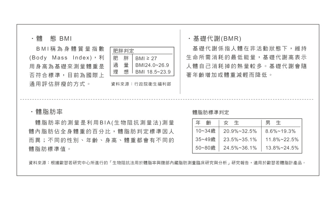 ◎體脂肪率:5.0~50.0%,遞增數值:0.1% 體脂肪率判定:偏低/標準/偏高/過高