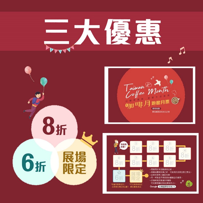 2. 咖啡月跑館月票1張,內含店家飲品「8折兌換」8杯、「6折兌換」1杯及【2019台灣國際咖啡展】「指定優惠兌換」1次