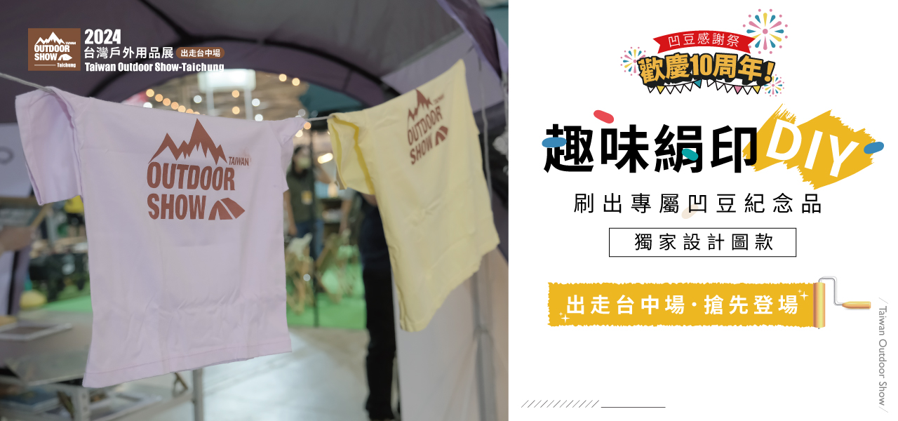- 體驗後請於現場拍照,並於【Taiwan Outdoor Show台灣戶外用品展】Facebook粉絲專頁的指定貼文下方分享照片與留言,與大家分享自己的凹豆絹印紀念品!