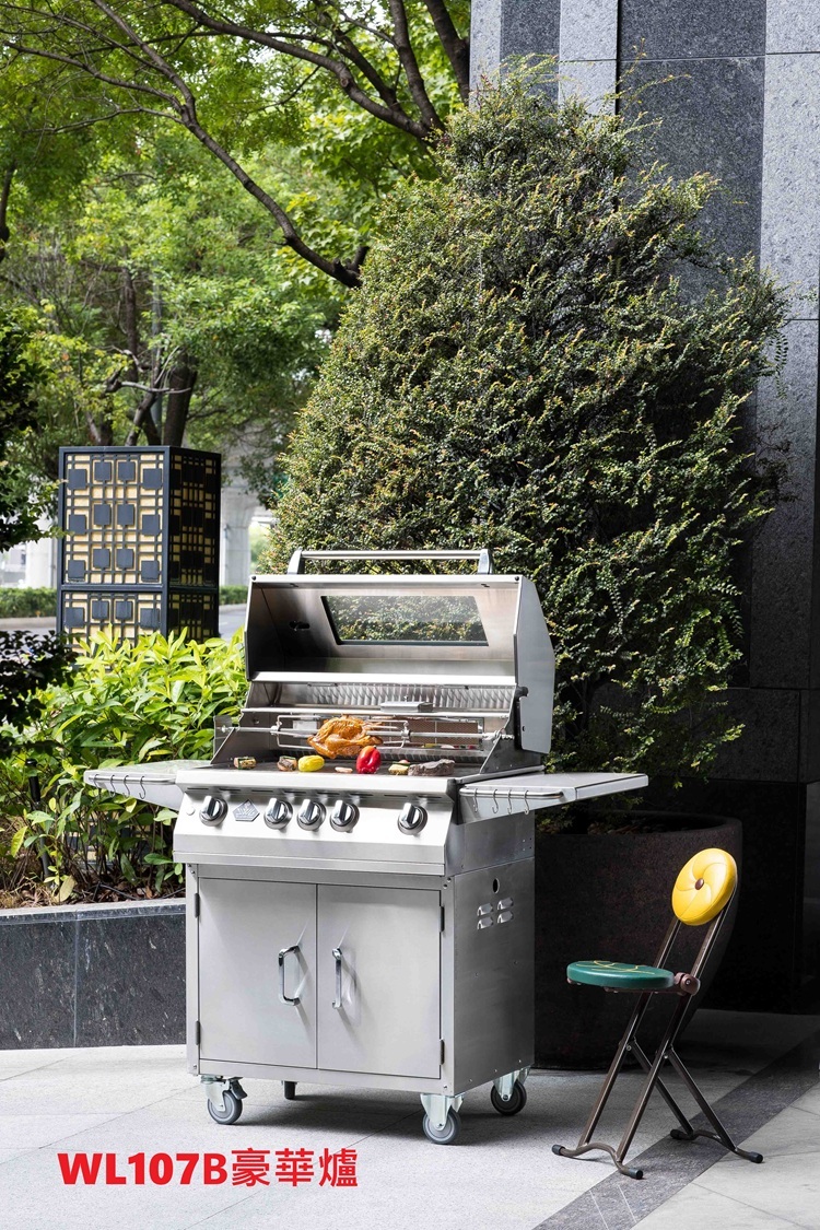 ● 75000BTU ● 4個鑄白鐵燃燒器 ● 紅外線後燃器 ● 保溫網/煙燻盒 ● 旋轉支架附馬達 ● 2段式安全金屬開關 ● 烤肉面積:760*490mm ● 含車架和置物板尺寸:長1417*寬636.5*高1240mm